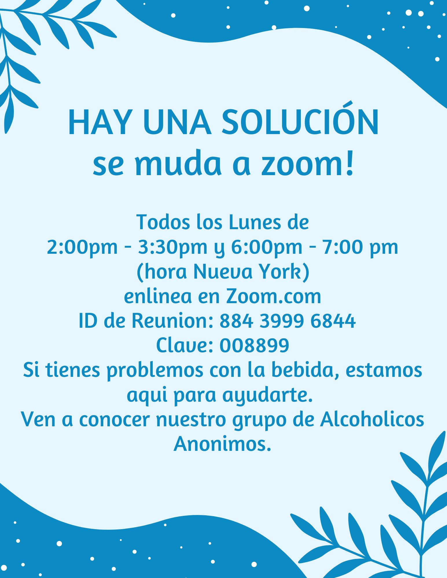Hay Una Solucion Todos los Lunes de 6-7 pm ID de Reunion: 884 3999 6844 Clave: 008899 + Add to Google Calendar + iCal / Outlook export 00 days 00 hours 00 minutes 00 seconds Date Oct 13 2025 Time 6:00 pm - 7:00 pm Location Virtual Zoom Meeting https://zoom.us/j/93709212090?pwd=TXlnOWwyY3FweDEyNG9FM0N4VmM3UT09 Share this event