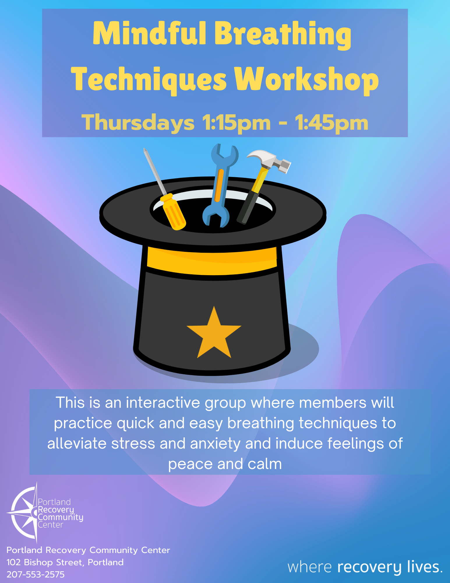 This is an interactive group where members will practice quick and easy breathing techniques to alleviate stress and anxiety and induce feelings of peace and calm.