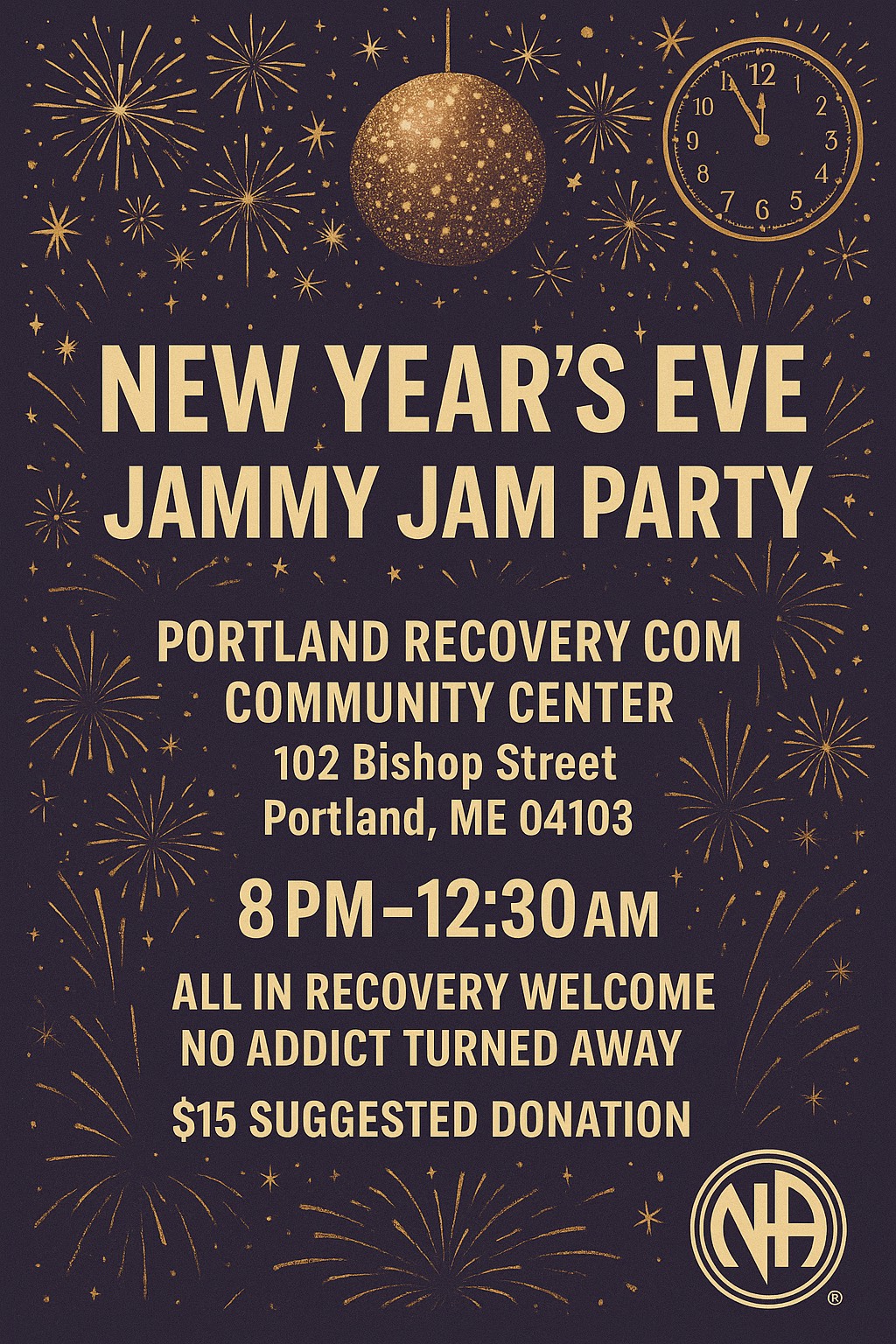 New Years Eve Jammy Jam Party + Add to Google Calendar + iCal / Outlook export 00 days 00 hours 00 minutes 00 seconds Date Dec 31 2025 Time 8:00 pm - 12:30 am Location Portland Recovery Community Center 102 Bishop Street, Portland ME 04103 Share this event